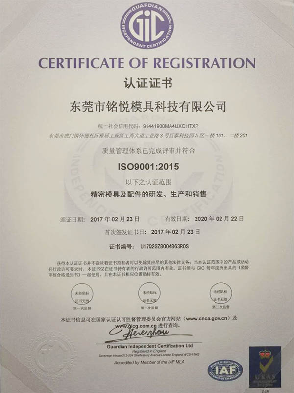 铭悦模具证书